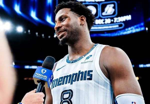 队友拼抢到前场篮板后里德防无球走神,JJJ立即向侧翼空手移动和里德拉开距离,随即接球三分抬手就进。
