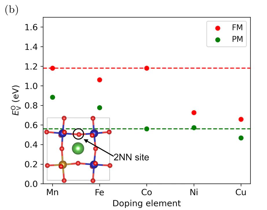 。La₀.₅Sr₀.₅CoO₃魏等的分析表明,钴基钙钛矿中不同掺杂元素和磁序对氧空位形成能有显著影响,直接关系到氧离子的迁移和扩散。