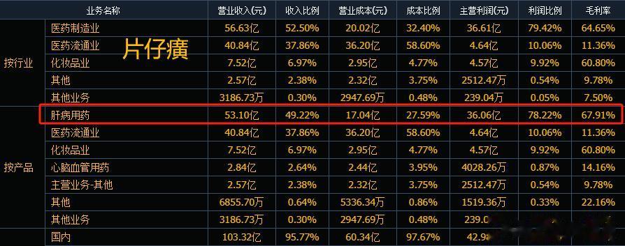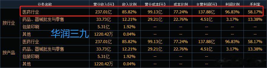 要说业务结构,华润三九应该算是几个公司里最好的,85%的制药业务,12%的流通业务,正好配套公司999感冒药等OTC药品的零售。