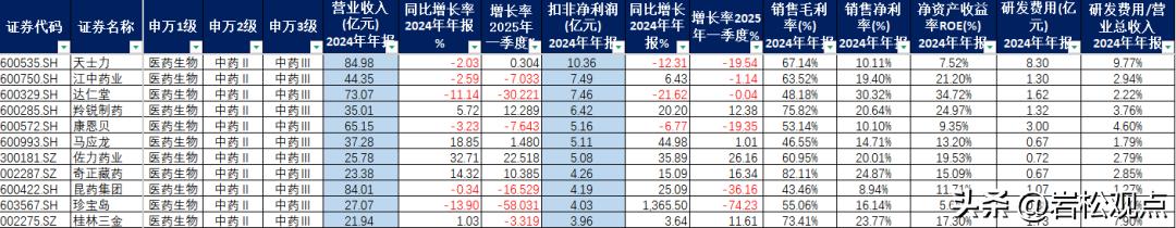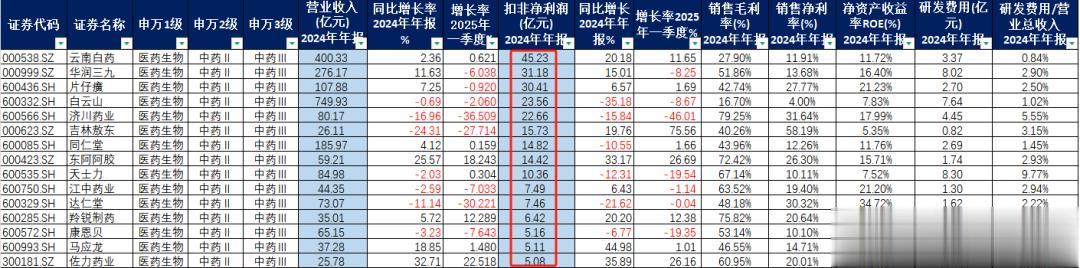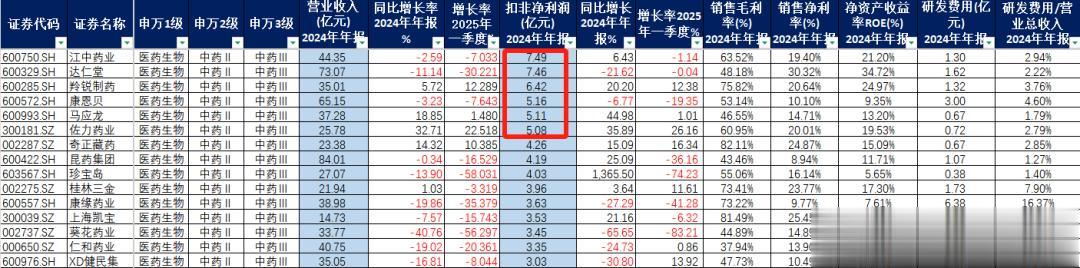 另外,天士力营收85亿,利润达到10亿,而且研发投入达到8亿,在10家利润超过10亿的公司里是最高的,研发费用占2024年营业总收入比例达到9.8%,算是一众“10亿中药”龙头里“研发”含量最高的公司。
