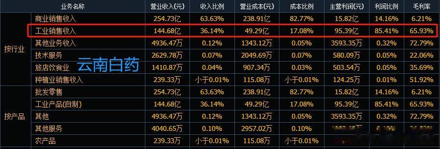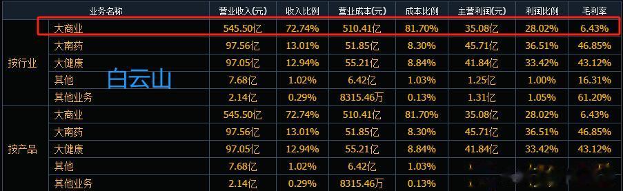 从盈利指标看,白云山毛利率只有16.7%,净利率只有4%,真的是少得可怜。进一步看看白云山主营业务就知道原因了,公司70%多的收入是大商业,就是中/西药的批发、零售业务。白云山的制药业务其实只有100亿左右,另外100亿是凉茶(王老吉),算消费品业务。有没有感觉,远看是行业第一的巨人,走近扒开衣服,却发现里面是个小孩。