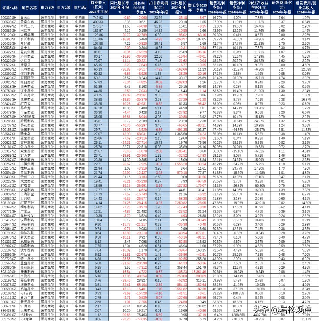 先看营业收入,排第一的白云山收入750亿,往下云南白药收入400亿,再往下是华润三九收入276亿,继续往下看就是4家收入100~200亿的公司,包括同仁堂、太极集团、步长制药、片仔癀。行业龙头必定在这几个公司里,再从利润看看就知道谁是真正的龙头了。