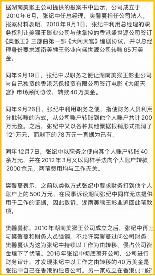 简单来说就是爆料直指张纪中,在2010年9月1日从美猴王转走了65万美元,19天后又转走了40万美元,7天后再次转走200万。