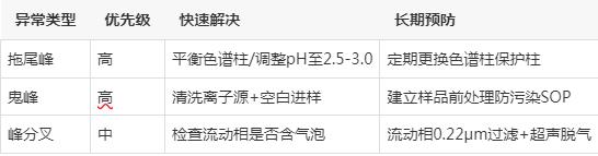 (2)流动相不匹配:反相色谱使用正相流动相、缓冲盐浓度过高(>0.5M)、pH值偏离色谱柱耐受范围。