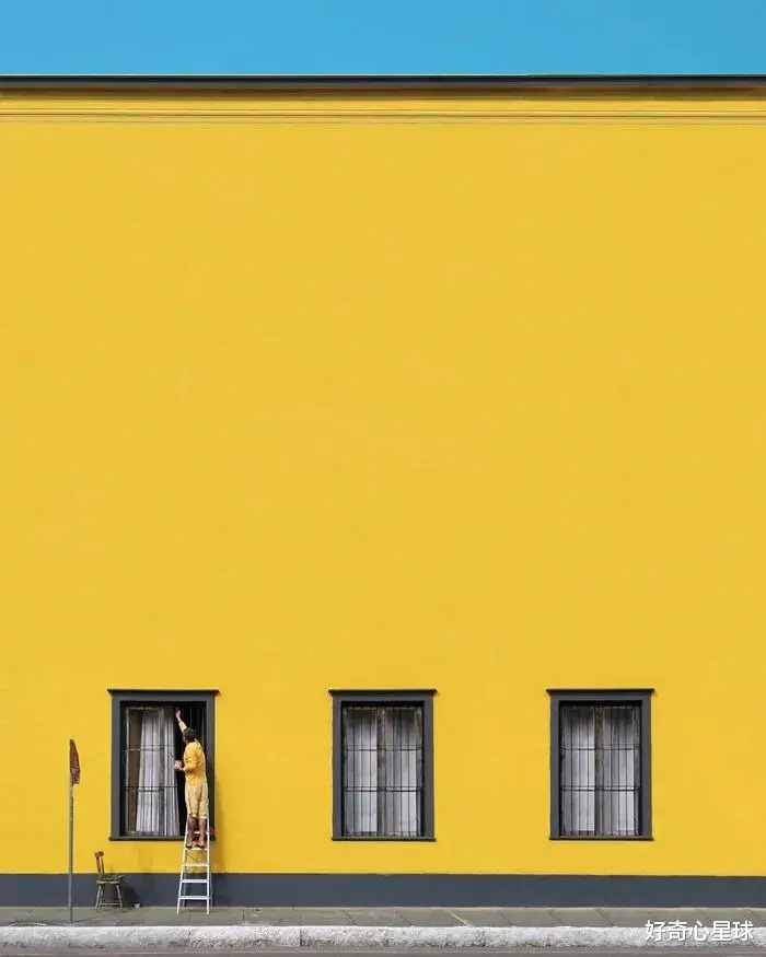 一张照片里如果塞满了东西,你会看哪里?不知道,眼睛很累。但如果一张照片里只有一面黄墙和一个孤独的影子,你的视线会立刻被那个影子抓住。你会开始想:这个人是谁?他在想什么?他为什么站在那里?