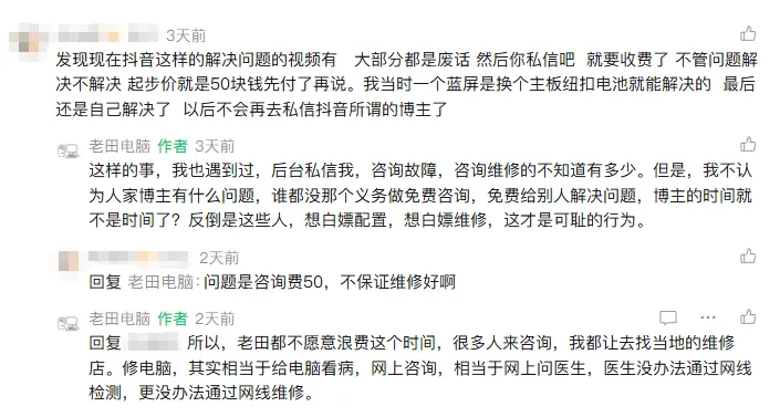 这位在网上看文章刷视频,发现里面讲述了跟自己电脑差不多的故障状况。不过,按照人家讲述的方法自己动手操作之后,问题并没有解决掉。所以,私信去问博主。然而,博主表示,咨询需要收费,50起步,先给钱再提供服务。于是,这位对于这些博主进行了谴责。