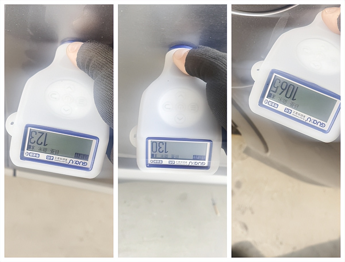 拿出来驱魔,仪检查车身漆面,绝大部分都正常,都是一百微米左右,就左后翼子板不正常,数据来到了1600多微米,看来做钣金了;