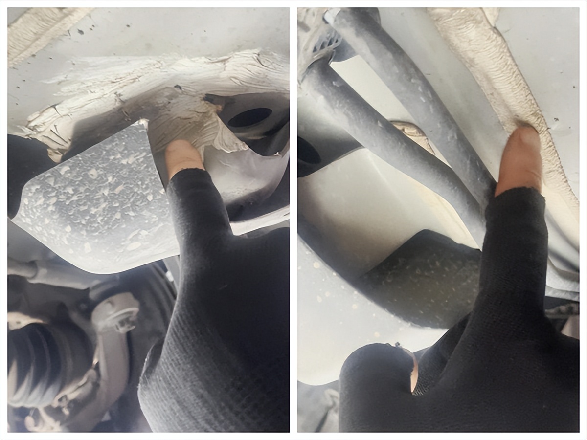 后边一点,A柱最底端的内侧,重新打胶了;对比一下左边,原厂是灰色,脏一些,而新打的胶是白色,干净很多;打胶就说明有变形和钣金维修,这个地方的变形,最大的可能就是托底了;
