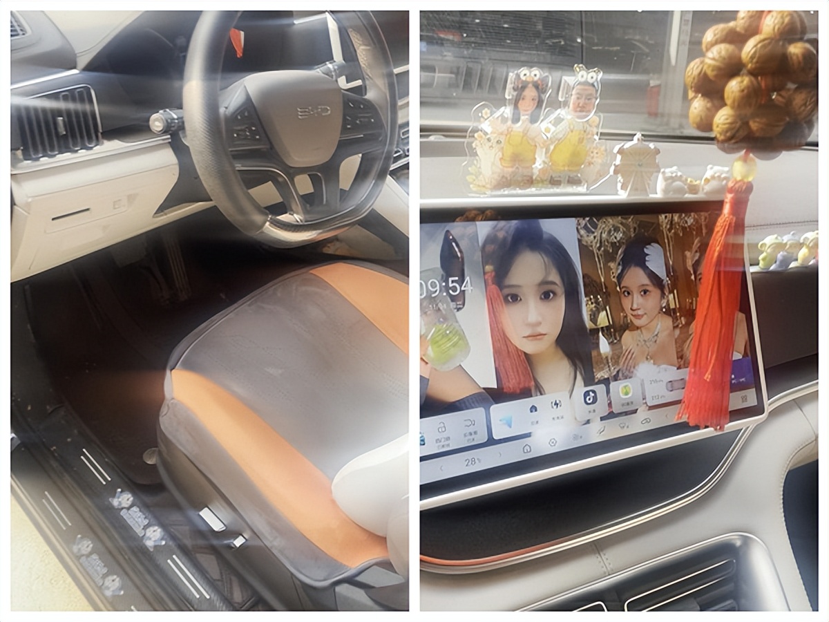 上车后能看到内饰的成色很好,最少九成新,车里还有喜洋洋的玩偶,天线宝宝,以及车主两口子的摆件和挂件;