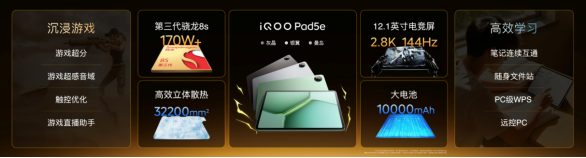 “永劫无间手游和王者荣耀职业联赛双推荐平板”iQOO Pad5e,它搭载第三代骁龙8s、12.1 英寸高清电竞屏、3W+mm² 高效立体散热、10000mAh 大电池,硬实力不虚,游戏超分更是同档断层领先,PC级WPS+ CAJViewer 更是专业生产力升级,学习办公超轻松;iQOO WATCH GT 2 搭载屏占比高达 82.4% 的 2.07 英寸超亮全景屏,局部峰值亮度 2400 尼特,配有 100 多种运动模式,不但可以记录心率、热量等数据,还具备全新电竞模式、接入满血版DeepSeek 的蓝心小 V 和碰一碰遥控器,33 天超长续航,更是做到全天候健康监测;iQOO TWS 5 全链路游戏延迟低至 42ms,四麦自适应降噪,降噪深度飙至 60dB,拿下 A+ 级 CAIA 降噪能力认证,并有升级的 Monster Sound 电竞声效和 48 小时超长续航,体验更好的跨生态无缝三连接和实时智慧翻译,全新主题弹窗,更有 KPL 电竞选手无畏定制弹窗和定制提示音,是专为游戏玩家打造的旗舰降噪耳机。