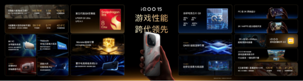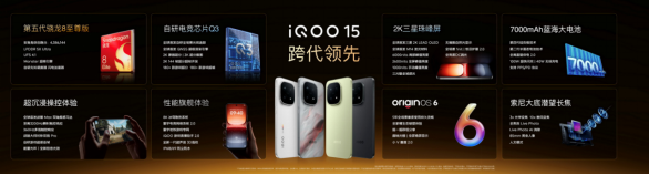 “跨代领先”iQOO 15 传承 iQOO 手机在实力和口碑的双重表现,搭载由第五代骁龙 8 至尊版领衔的“至尊性能组合”完全体,实现行业领先的性能表现,并在自研电竞芯片 Q3 和 Monster 超核引擎的支撑下,带来“全场景光线追踪+ 2K 原画超分+144FPS 无损超帧”,共筑行业领先游戏视效生态;更以全新演绎的国潮设计、超级潜望长焦以及更流畅智慧的 OriginOS 6等一系列强悍配置,打造一款“性能超长板,全面无短板”的未来性能旗舰。