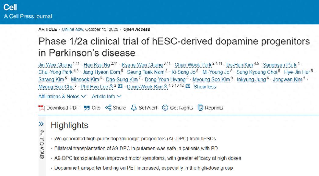 10月3日,《Cell》的研究报道“Phase 1/2a clinical trial of hESC-derived dopamine progenitors in Parkinson’s disease”,详细报道了一项利用人胚胎干细胞 (human embryonic stem cells, hESCs) 衍生的多巴胺能祖细胞 (dopaminergic progenitors) 治疗帕金森病的I/IIa期临床试验结果。这项研究不仅为我们展示了这项疗法的安全性,更在疗效上带来了令人振奋的初步证据,为无数患者和家庭点燃了新的希望之光。