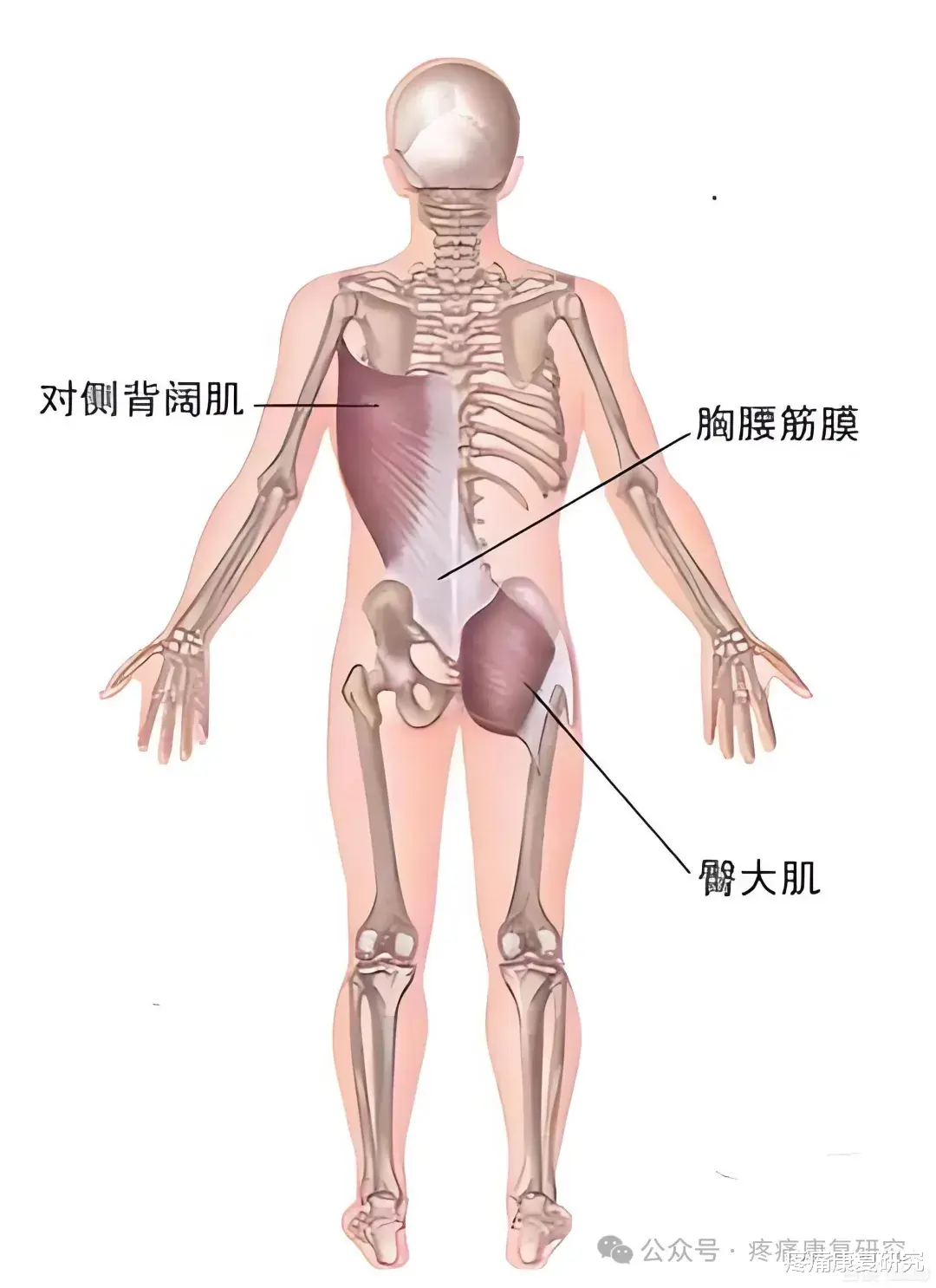 腰背部肌群(竖脊肌、腰方肌、背阔肌)和股前肌群(髂腰肌、股直肌、阔筋膜张肌)牵拉紧张。
