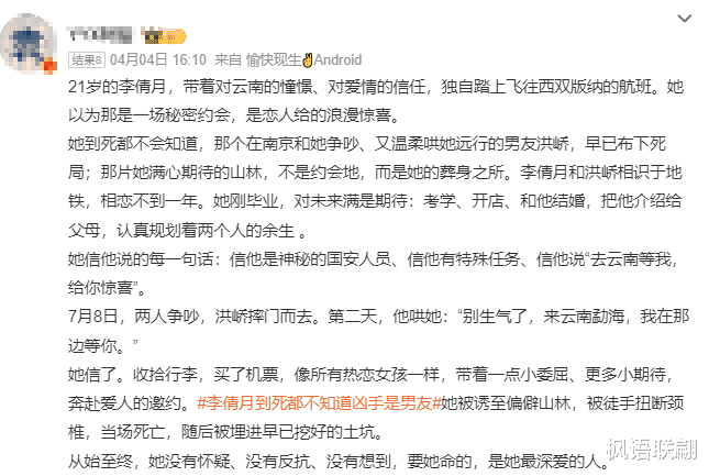 一名刚拿到大学毕业证书6天,手还没摸热的21岁女大学生李倩月就被男朋友洪峤骗到外地杀害了。
