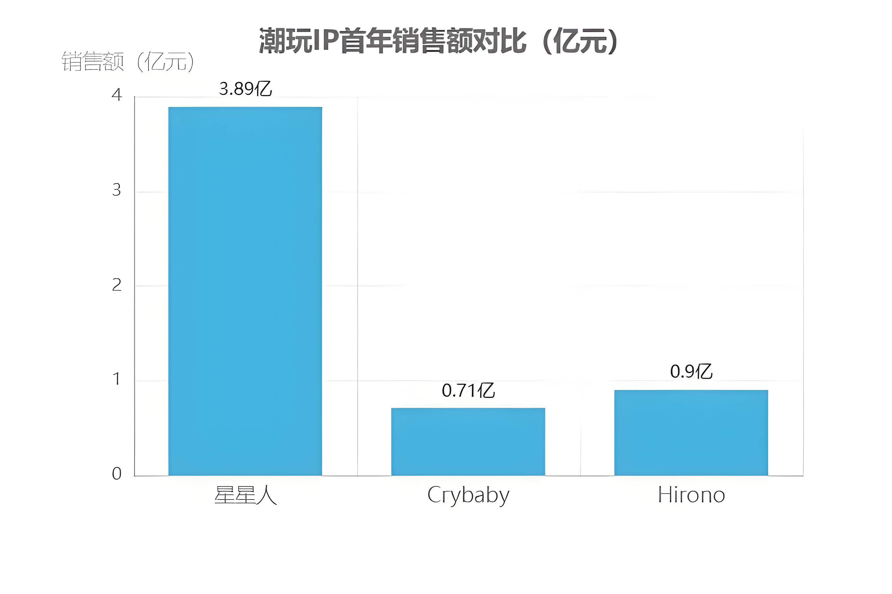 2024年,泡泡玛特签约星星人,通过商业化运营将这一绘本角色推向大众视野。仅6个月,其销售额便达3.89亿元,远超同期Crybaby(0.71亿元)与Hirono(0.90亿元)的首年表现,成为“旗下成长最快的新锐IP之一”。