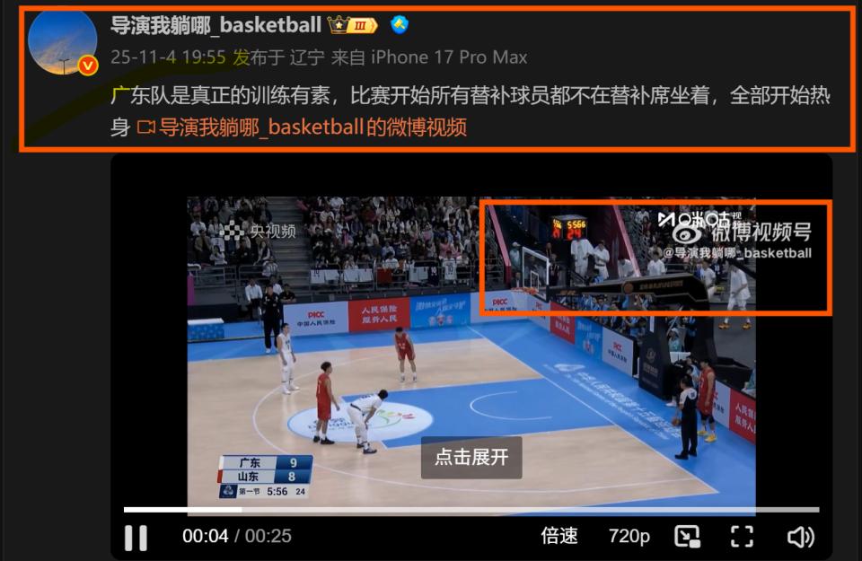 然而,广东队这种近乎奢侈的阵容轮换和战术安排,在赛场之外却激起了千层浪,特别是来自老对手辽宁方面的舆论。拥有70多万粉丝的辽宁知名媒体人“导演躺那”赛后第一时间发文,他敏锐地观察到一个细节:比赛刚开始,广东队的替补席上竟然是空的,所有球员都已在场边开始热身。该媒体人随即用一种“酸溜溜的嘲讽味道”评论广东队“真正的训练有素”。这番话的弦外之音不言而喻,显然是将其与杜锋的“五上五下”战术联系起来。这种评论的背后,清晰地反映出一种复杂的情绪。杜锋指导这种利用绝对板凳深度进行轮换的风格,在辽宁球迷群体中似乎始终是一个难以释怀的芥蒂,被部分人视为一种资源上的炫耀,而非纯粹的战术博弈。(信息来源@导演躺那)