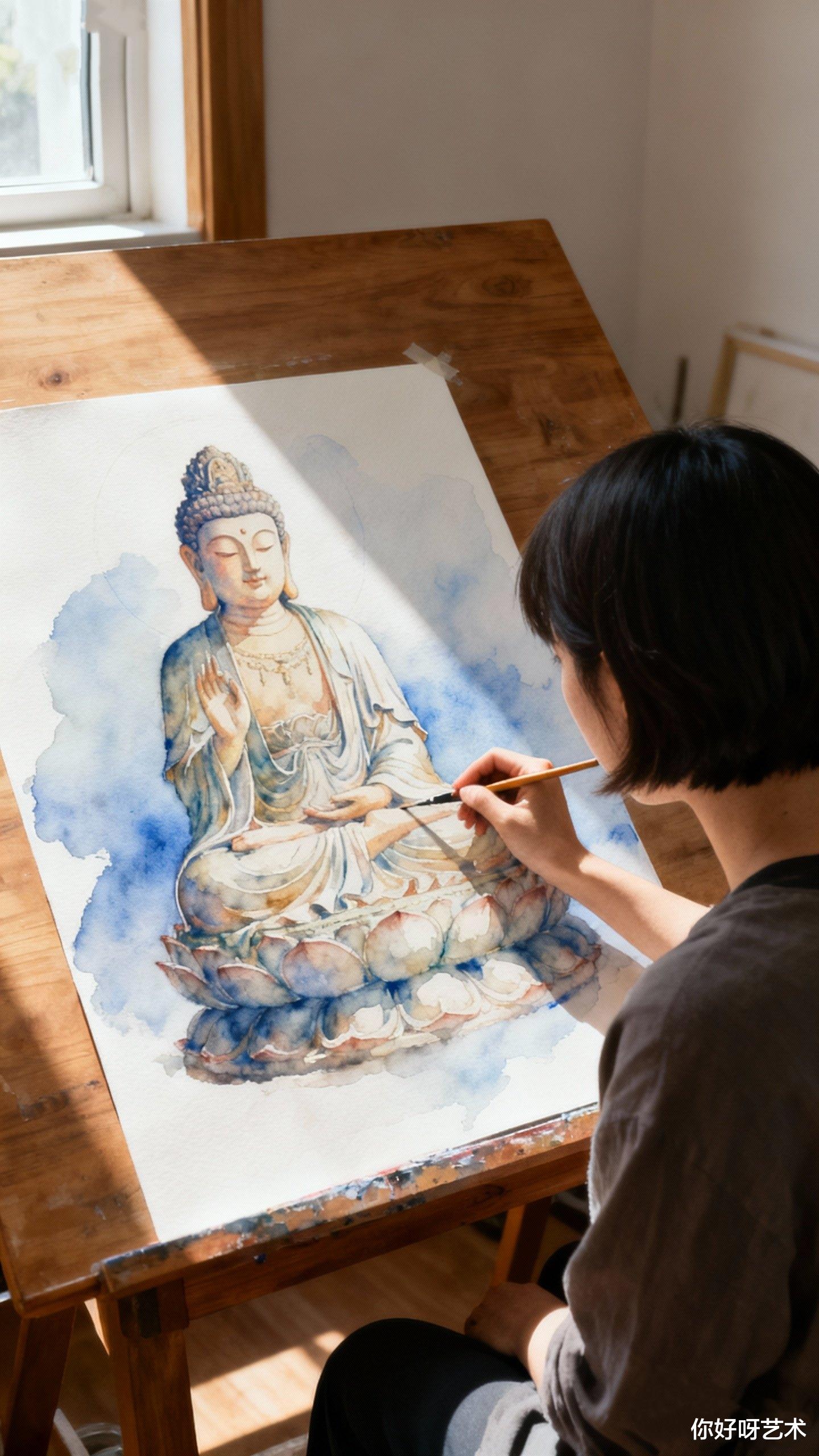 画室的角落里,一只老式收音机正播放着梵音,旋律像溪流般流淌,轻盈而悠远。我听着音乐,笔尖在纸上轻轻跳跃,时而勾勒出佛像眉宇间的庄严,时而描绘出衣纹中的禅意。冬日的阳光透过玻璃窗,洒在画纸上,将水彩的透明感渲染得淋漓尽致。我甚至能感觉到,画中的佛像正用他的慈悲,温暖着这个寒冷的冬日。