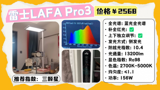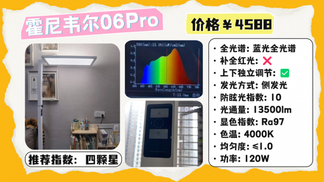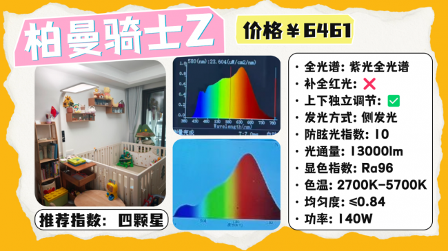 全光谱大路灯推荐哪款?柏曼是一款采用紫光激发的全光谱护眼灯,核心配置比较好,从实测光源上看,其蓝光只有0.6左右,并且光谱波段连续,能够呈现较为舒适的光线,实际显色指数在98左右,并且上下发光的照明设计,并且采用微棱晶板有效的减少了眩光,实际防眩光指数在10左右,另外在操作上,采用的是触控、旋钮的调节设计,支持无级调光以及功能切换。