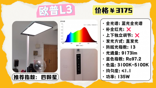 全光谱大路灯推荐哪款?欧普悦瞳L3采用一体式发光面结构,照明覆盖大约在10–30㎡范围,上下光源支持分别调节,可以按使用需求做分层照明,实测照度均匀度约1.03,配合4000K色温,整体光线比较明亮,色彩还原也相对自然,功能上支持语音控制,并加入小夜灯模式,日常使用会更方便一些,不过整体亮度偏高,刚开始使用时如果对强光比较敏感可能会有点刺眼,同时在自然光还原方面还有一定优化空间。