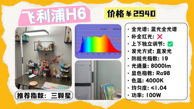 全光谱大路灯推荐哪款?飞利浦H6采用前延式灯头设计,让出光位置更靠前,桌面覆盖范围会更大一些,实测照度均匀度大约在1.04左右,显色指数做到Ra98.2,色彩还原表现不错,用在阅读、写字或绘画场景下,颜色分辨会更清晰,功能上还加入了小夜灯模式,使用场景相对更灵活,不过需要注意的是,它依然属于直射式出光结构,虽然官方标注UGR<19,但在高亮状态下还是可能会有一定眩光,另外光谱里红光补充不足,在自然光还原这一点上还有一定短板。