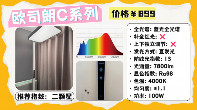 全光谱大路灯推荐哪款?欧司朗C系列采用直下式出光结构,搭载欧司朗定制芯片,光线调校偏向接近自然光,顶部加入了漫反射设计,可以提供一定的环境补光,让整体照明更均匀一些,同时也配备了防频闪技术,光输出稳定性还可以,长时间使用对眼睛负担相对小一点,操作是触控面板形式,日常调节比较直接,但功能上相对基础,没有入座感应或恒定照度这类自动调节设计,同时光源在抗衰减表现上也比较一般。