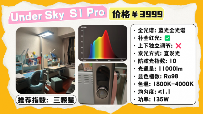 全光谱大路灯推荐哪款?UnderSky S1 Pro支持1800K–4000K的宽范围色温调节,可以覆盖学习、阅读以及夜间放松等不同使用场景,发光面出光相对均匀,实测照度均匀度大约在1.1左右,整体亮度分布比较稳定,光源采用全光谱LED灯珠,显色指数达到Ra98,日常使用时色彩还原表现不错,亮度和色温也都支持按需调节,不过需要注意的是,这款灯整体以直射出光为主,光感相对会偏强一些。