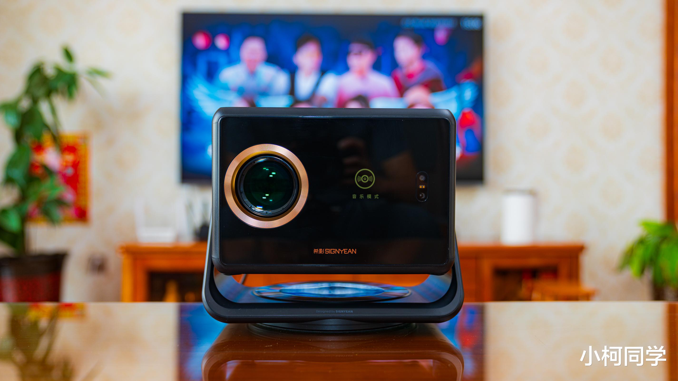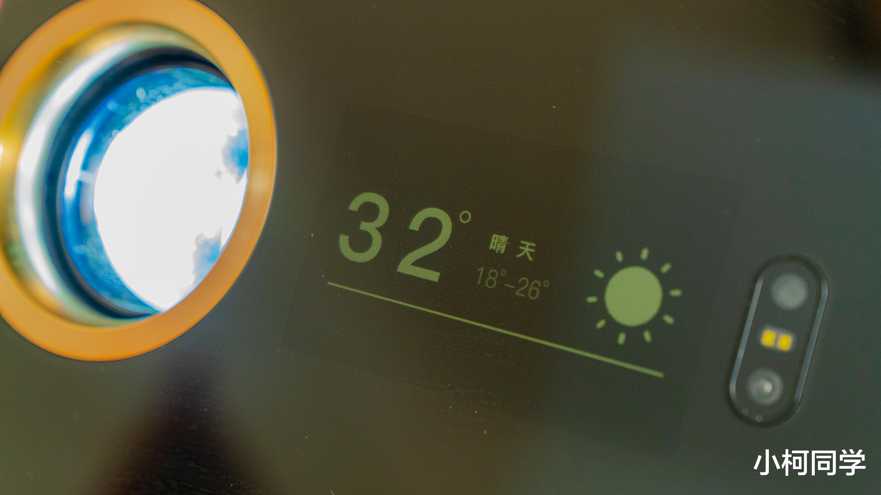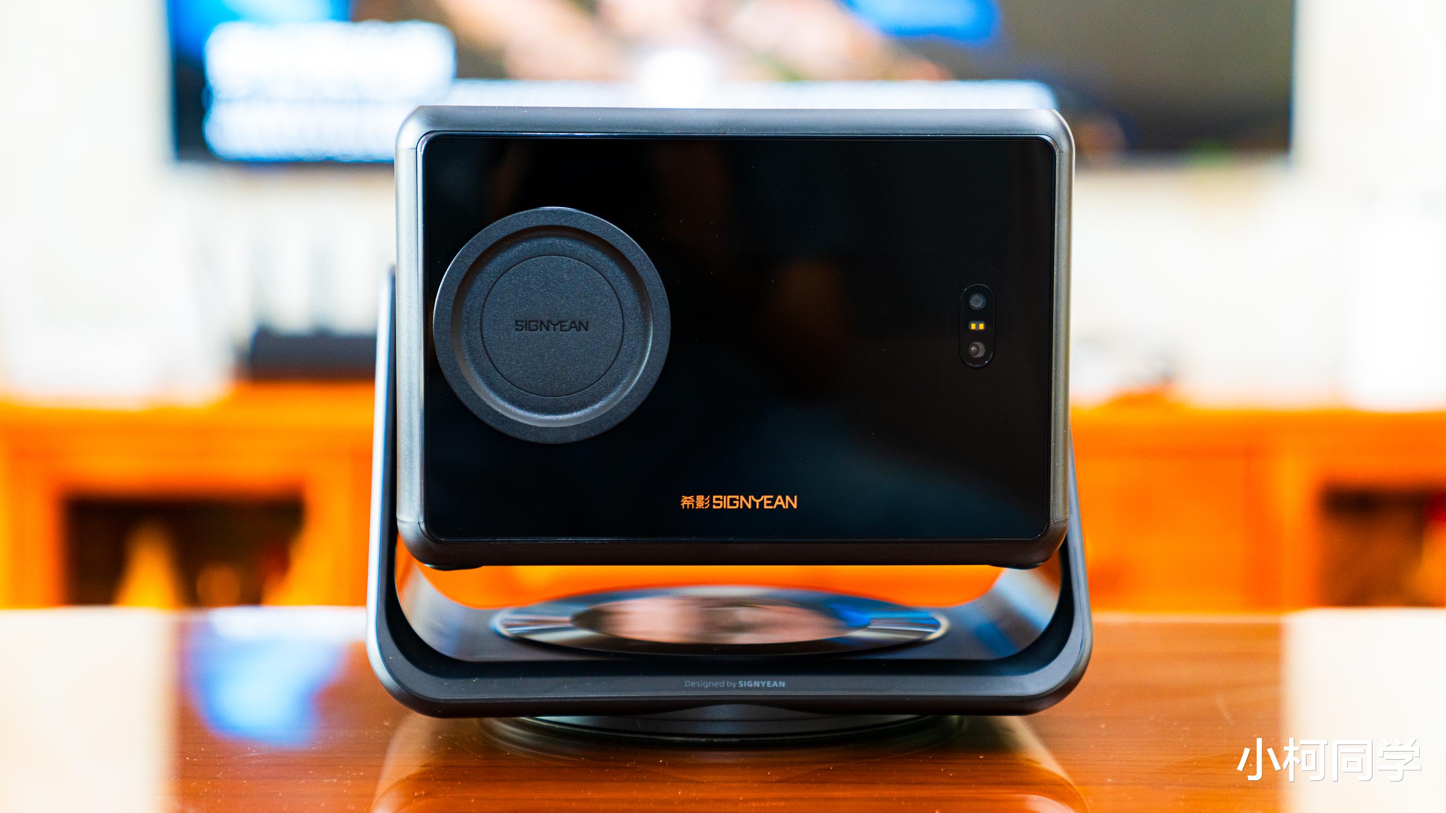 投影仪正面左侧为投影镜头,右侧为TOF镜头和红外镜头,中间部分则是悬浮显示屏,底部为机械云台。
