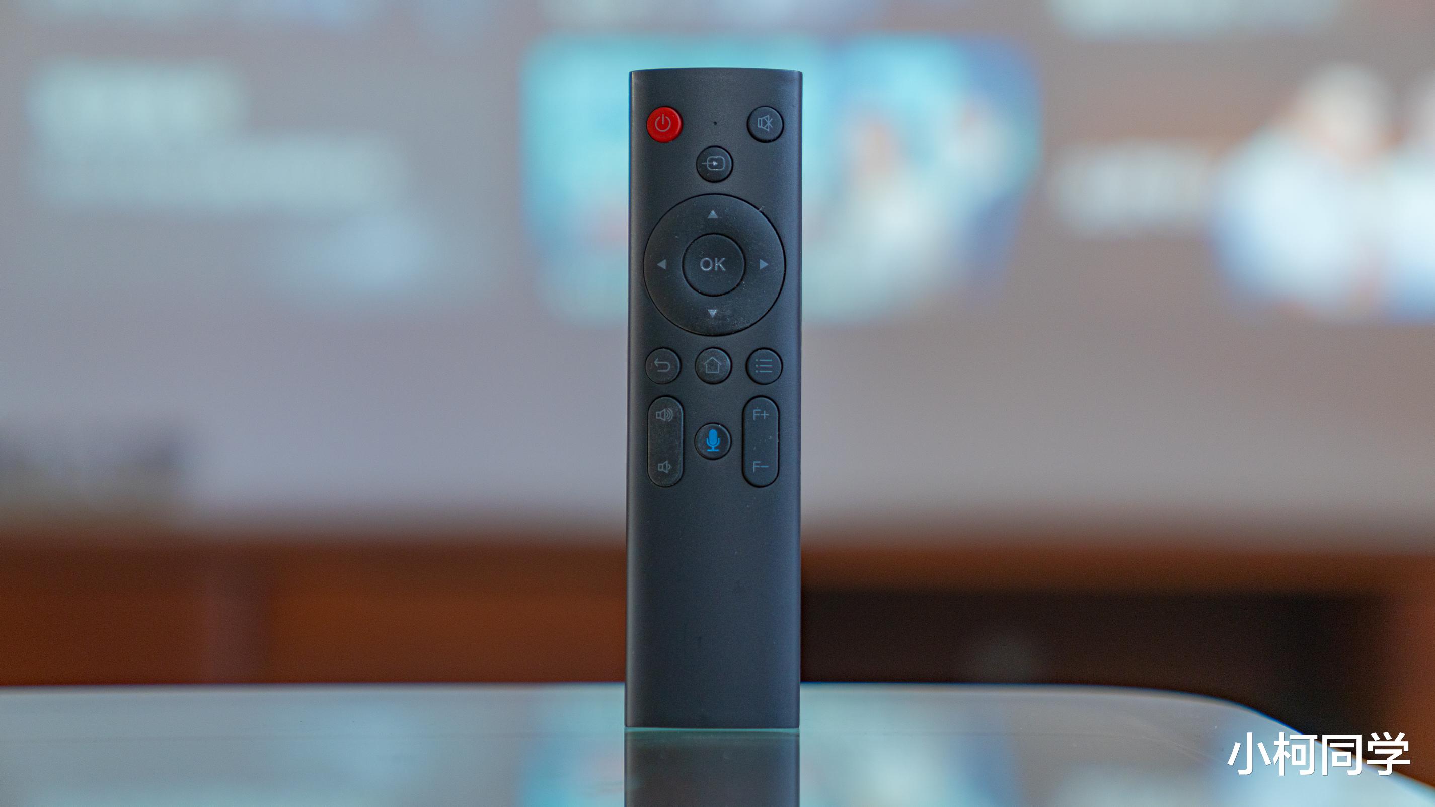 遥控器的按键依次为电源键、静音键、信号源键、方向键及确认键、返回键、主页键、菜单键、音量+/-键、语音键以及焦距+/-键。