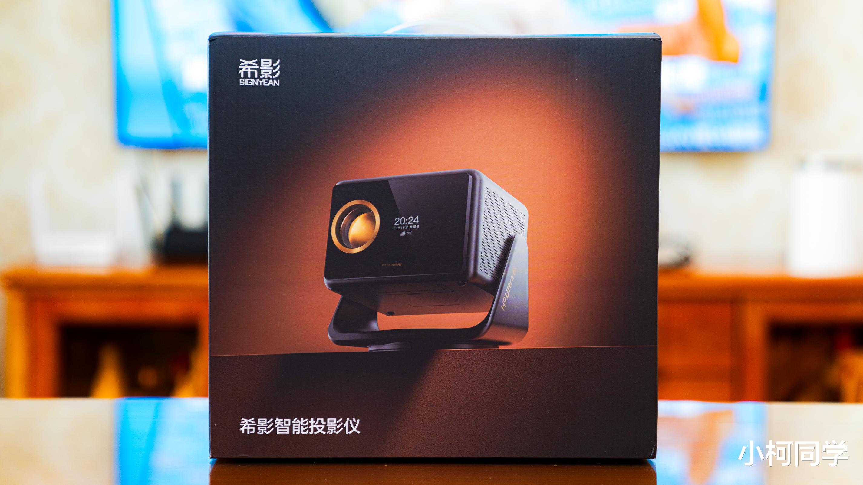 包装正面有希影(Signyean)的中英文LOGO,中间为这款投影仪的使用效果渲染图。