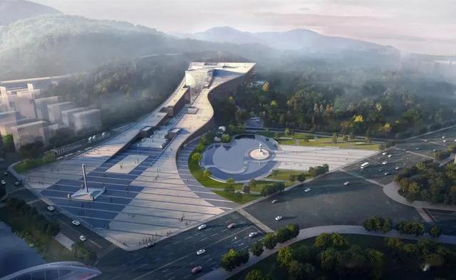 其博物馆主体建筑位于半山腰,40米通高的巨大玻璃门厅取自甲骨文“商”字酒器。