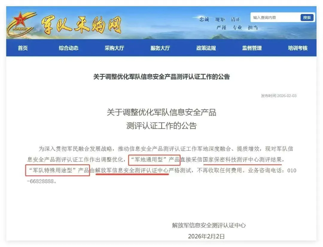 改革核心内容包括两大方面:一是对"军地通用型"信息安全产品,直接采信国家保密科技测评中心的测评结果,避免重复检测;二是对"军队特殊用途型"产品,由解放军信息安全测评认证中心进行严格测试,并明确不再收取任何费用。