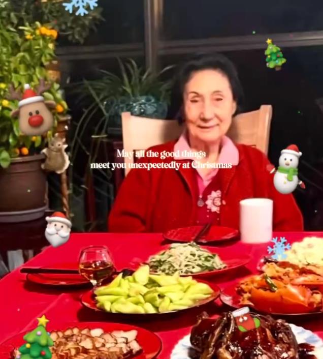 视频里的童葆苓头发乌黑,脸部皮肤没有过分松弛,精神饱满。她身着喜庆的红色毛衣,面前的餐桌上摆着烤鸭、龙虾、卤肉等美食。