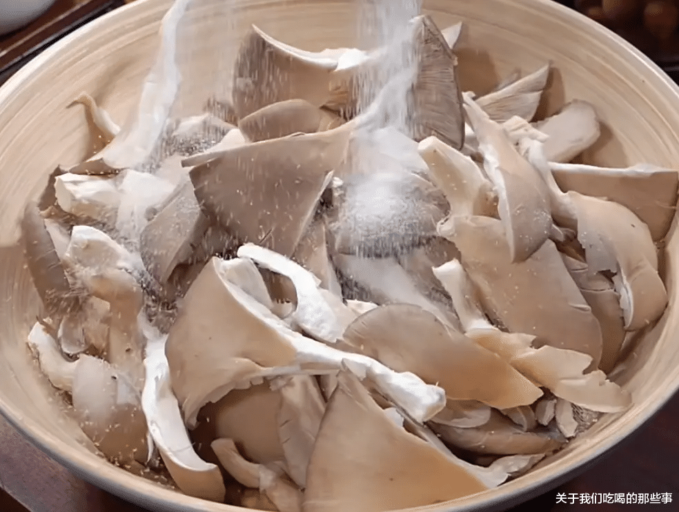 切不可撕小块后就裹糊炸,那样的话水分太大,不容易炸酥脆,也不要撕块后直接挤水分,这样做会把平菇挤烂。记住这个小技巧,先加少许盐腌制片刻。