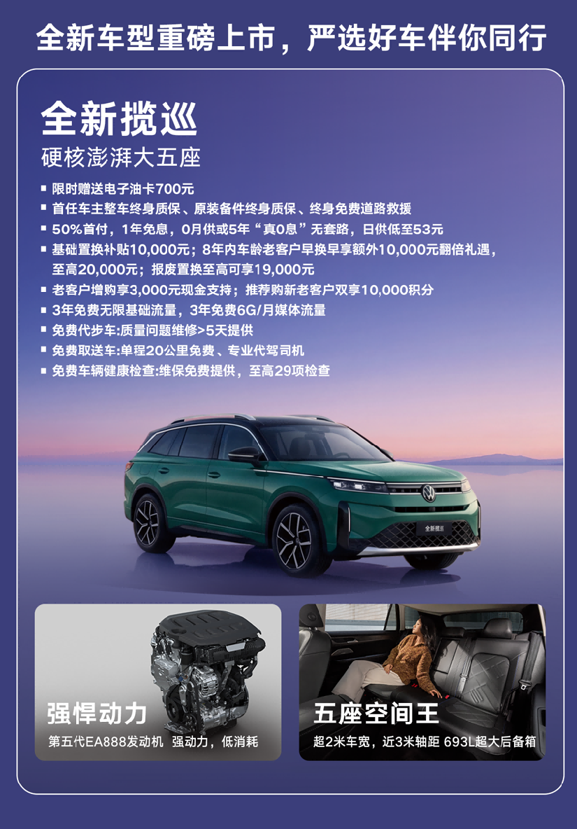 空间与安全配置同样无可挑剔,全新揽巡5007mm的车长、2015mm的车宽带来同级领先的内部空间,纯大五座布局让后排乘坐更舒适,693L后备箱满足家庭装载需求。安全方面,德系高强度车身搭配1000MPa热成型钢板,多方位安全气囊提供被动防护,IQ.Pilot系统与PLA3.0泊车、TPMS胎压监测等主动配置构成全维度安全防线。