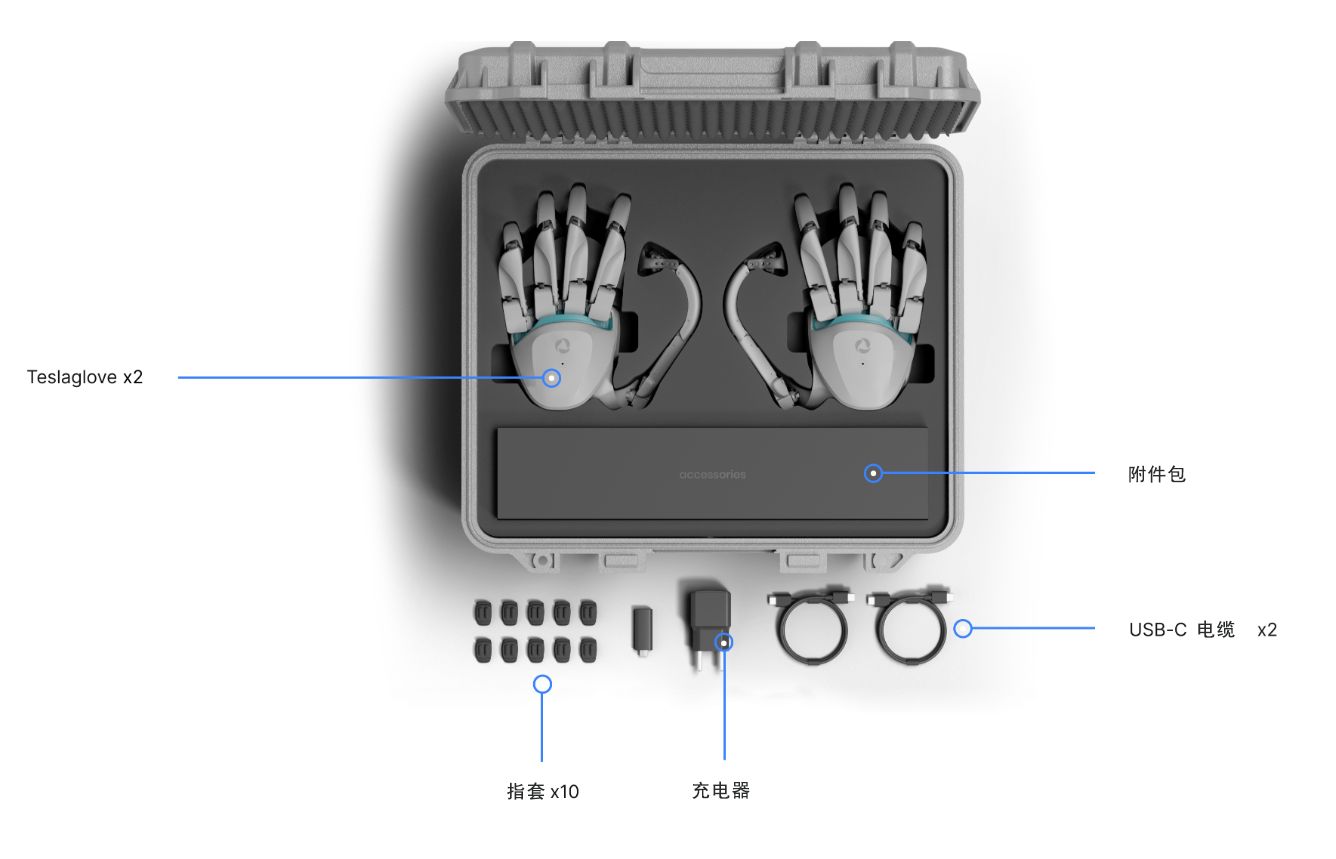 TESLAGLOVE的外骨骼可提供2.8-3.3千克*厘米的扭矩与300Hz更新率,每只手指可提供最大9N的阻力以模拟抓握物体的刚性与形状。