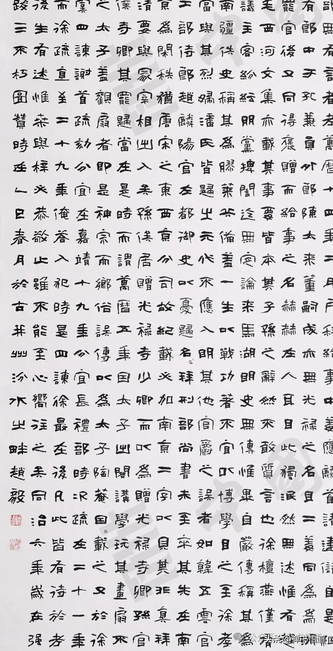 我们看到,此作是小字隶书,全文共一千五百余字,满满当当的一整篇,章法中规中矩,比较传统,不似时下的流行书风所提倡的搞怪风格,这一点是值得肯定的。这样的作品,内容大于形式,必须依靠实实在在的字体结构、点画线条去打动评委,弄不了花架子。