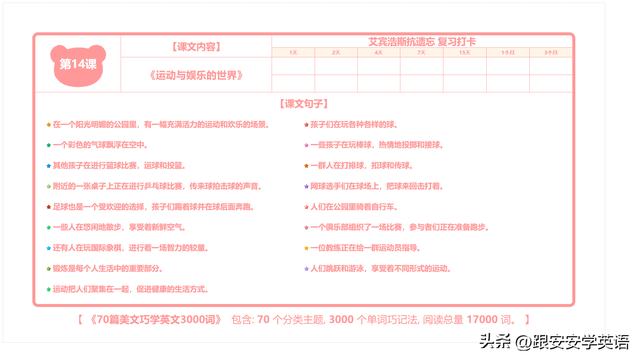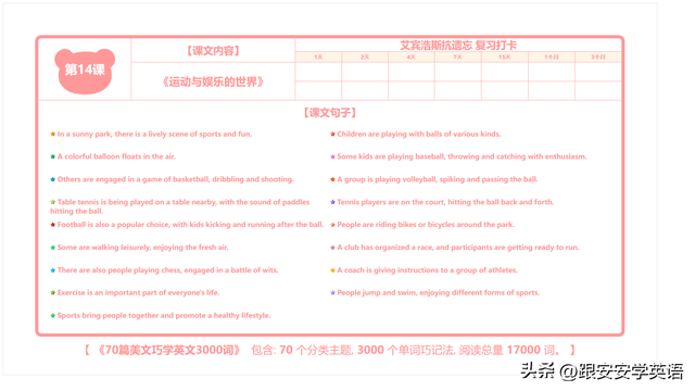 今天连载安安老师原创初中英语速学课程——《70篇美文速记中考英语3000单词》,本套课程用70个英文小故事短文按分类串记学习初中阶段3000英语单词。今天分享第14讲,篇名为《The World of Sports and Recreation》(第14篇 《运动与娱乐的世界》)。