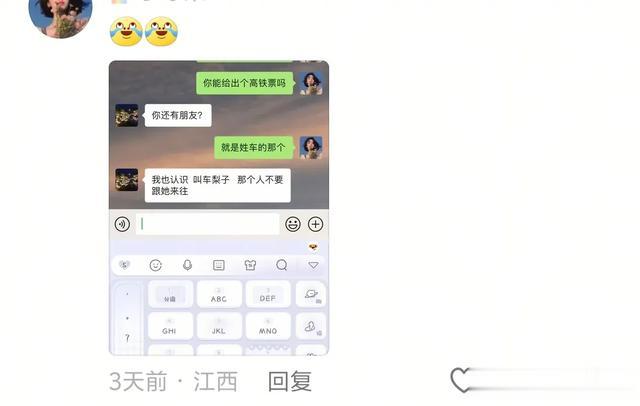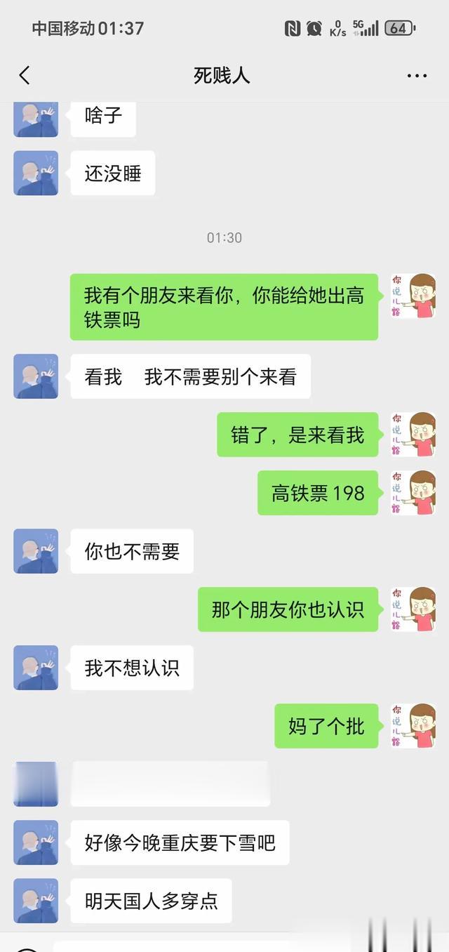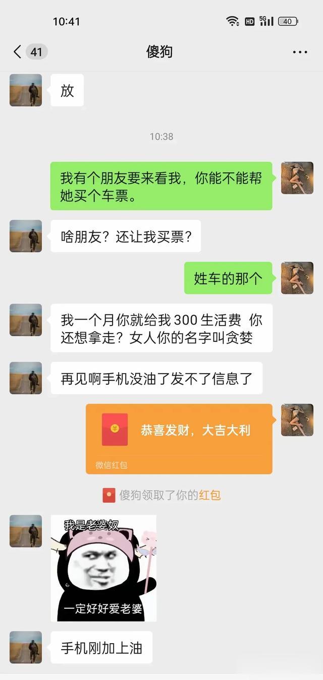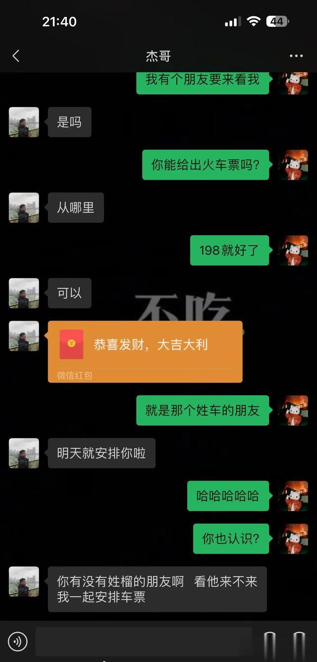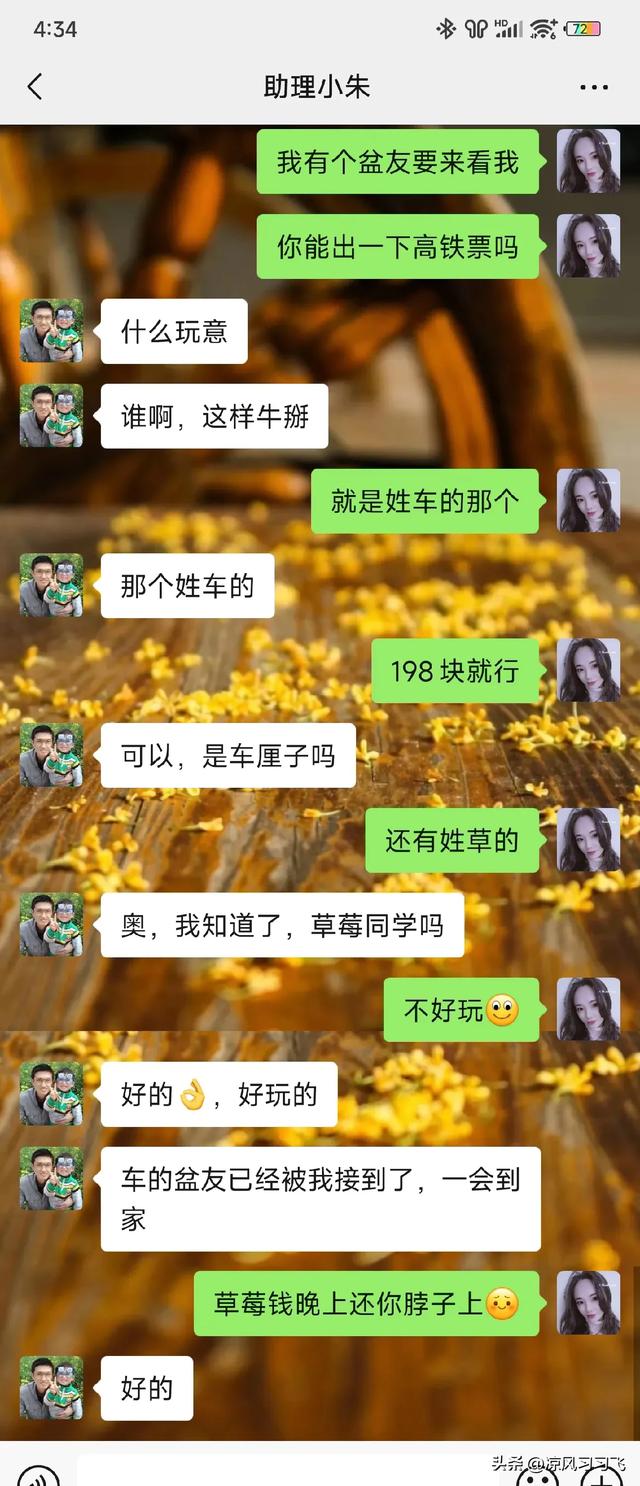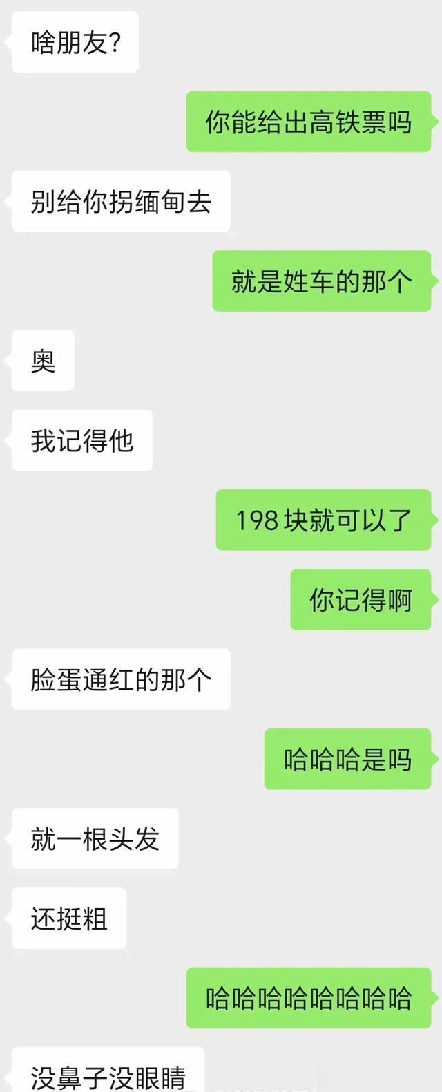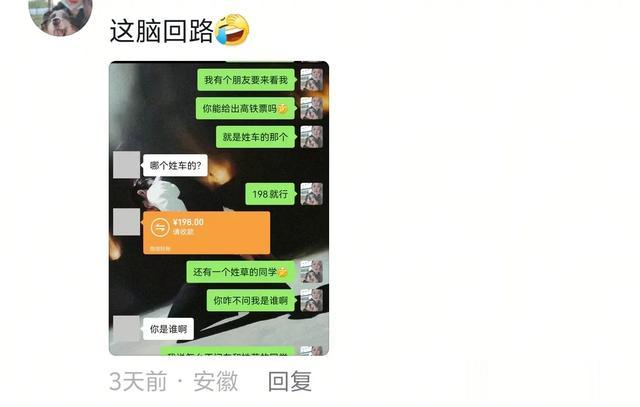 “我有个朋友要来看我”第一句就把事情先加个背景,对方会首先觉得有个朋友来看自己,挺好的事,赞成;下一句“你能出高铁票吗”?乍一看对方肯定有点懵,来就来怎么还要我掏路费了?惊呆;再来一句补充“就是姓车那个”,哦豁,这是谁?不太记得,但是你都把姓说出来了,都说真诚是永远的必杀技,那我也不好拒绝,支持吧!