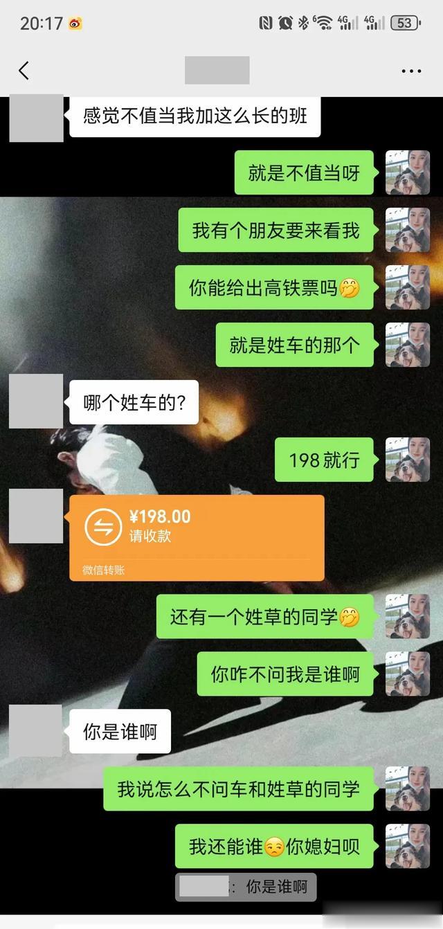随后对方回了:“可以啊,来找你玩”,看来对方是被我们引导成功了,接下来的事就顺水推舟一气呵成,报路费——转账——收钱,这时对方觉得自己都肯花钱了,那问详细点不过分吧?再说真不记得哪来的姓车的朋友,这个姓特殊,比较少见,听过应该不会忘记