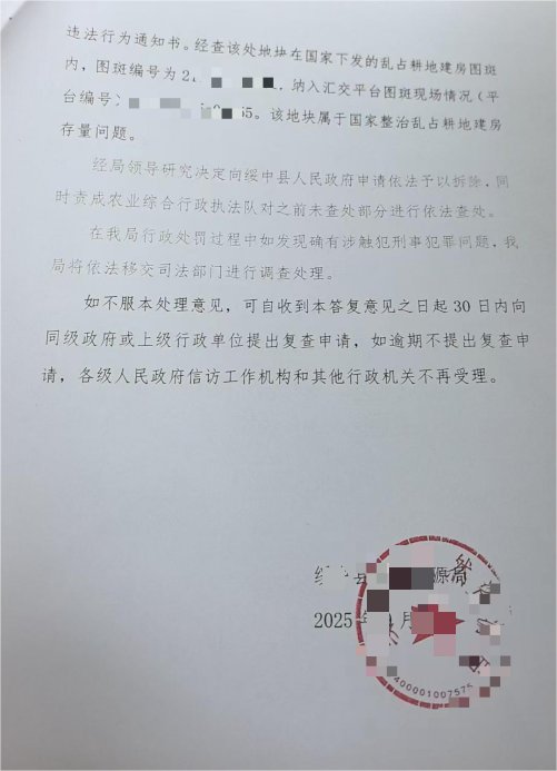 于某拒不履行处罚决定,2017年4月17日,绥中县人民法院作出(2017)辽行审号裁定书,明确准予强制执行该处罚决定。但截至目前,这座违建厂房仍未拆除,持续占用耕地。期间,绥中县自然资源单位多次下达限期改正通知书,并于2025年9月向县里申请依法拆除、责成执法队查处未整改部分,却始终未能解决问题。