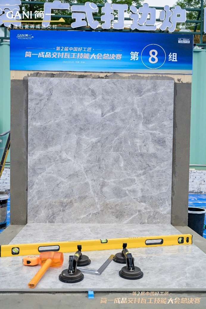 比赛当天,适逢“自然境·自由心——2024年简一美好家空间春季新品”正式发布。比赛现场用的正是简一春季新品大理石瓷砖,比赛现场气氛紧张而有序,每位选手都面临着在规定时间内完成瓷砖铺贴任务的挑战。他们或蹲或跪,手法熟练,动作迅速,或切或磨,展现出了工匠们的精湛技艺。每一块瓷砖的铺贴都经过精确的测量和细致的调整,以确保整体效果的完美呈现。这场比赛不仅是对选手们技艺的一次考验,更是对简一新品瓷砖品质的一次有力证明,也充分展示了简一新品瓷砖在质量以及铺贴效果上的卓越表现。
