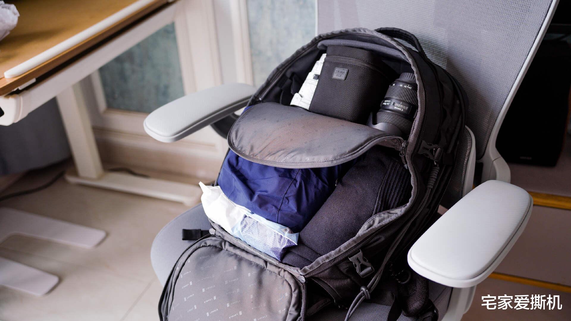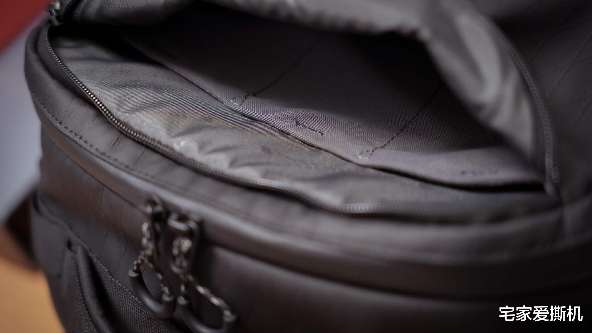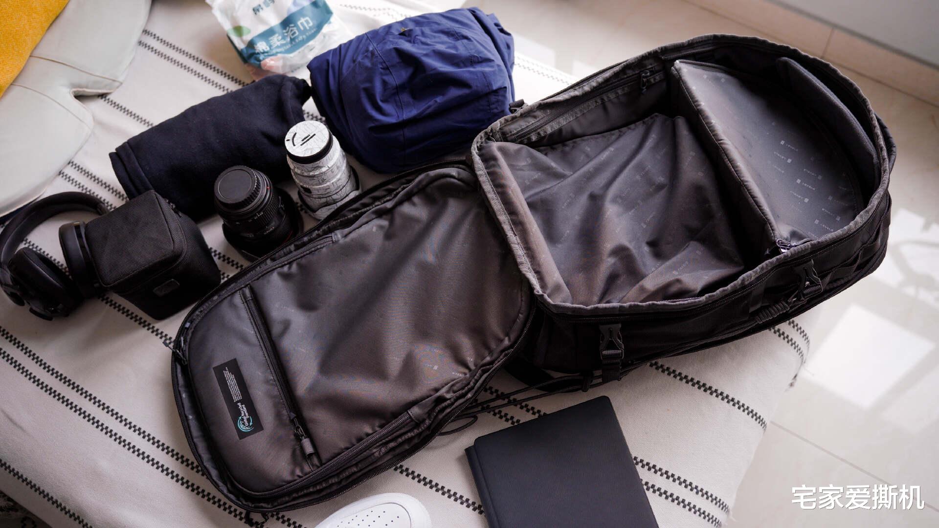 收纳能力是潜行者的核心竞争力,32L大容量相当于20寸登机箱,却通过精细化分区实现了 “扩容不混乱”,每样物品都能找到专属位置。主仓180°全开合,整理如行李箱:主仓采用 180° 全开口设计,拉链可拉至底部完全平铺,内部空间一目了然,过安检或酒店整理时无需掏空整包,效率翻倍。实测可轻松装入两套换洗衣物、洗漱包、数码收纳包,短途出差2-4天完全够用;极致情况下我装下了一条保暖软壳冲锋裤+三合一冲锋衣+换洗保暖内衣+一次性袜子及内裤,顶部还可以塞进去三颗67-77mm口径的镜头;顶部采用可变模块设计,需要时展开扩容,无需时放平节省空间,灵活适配不同装载需求。