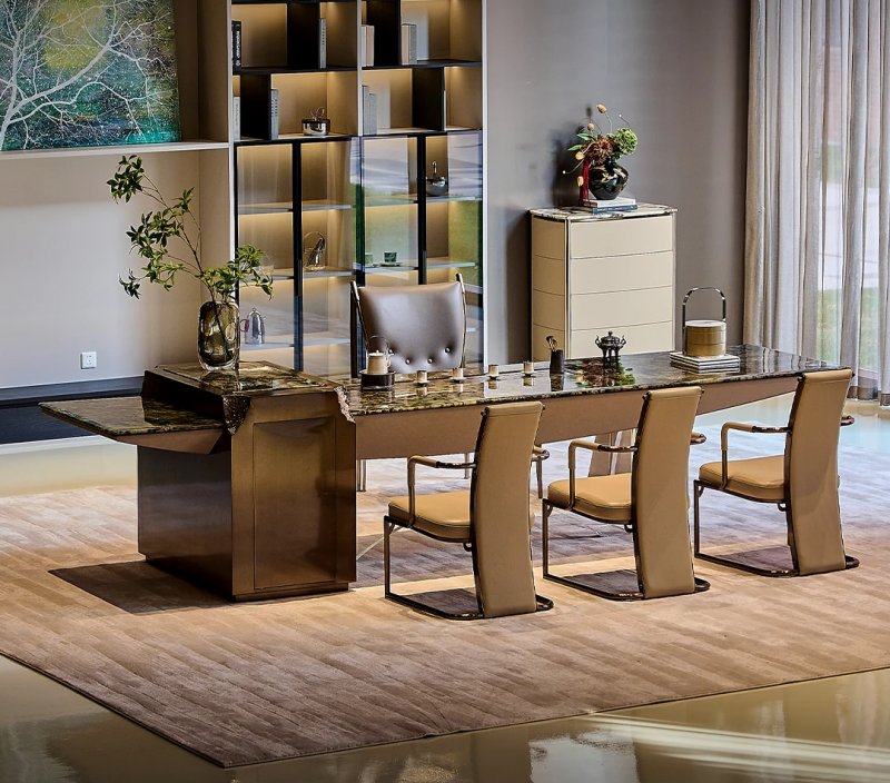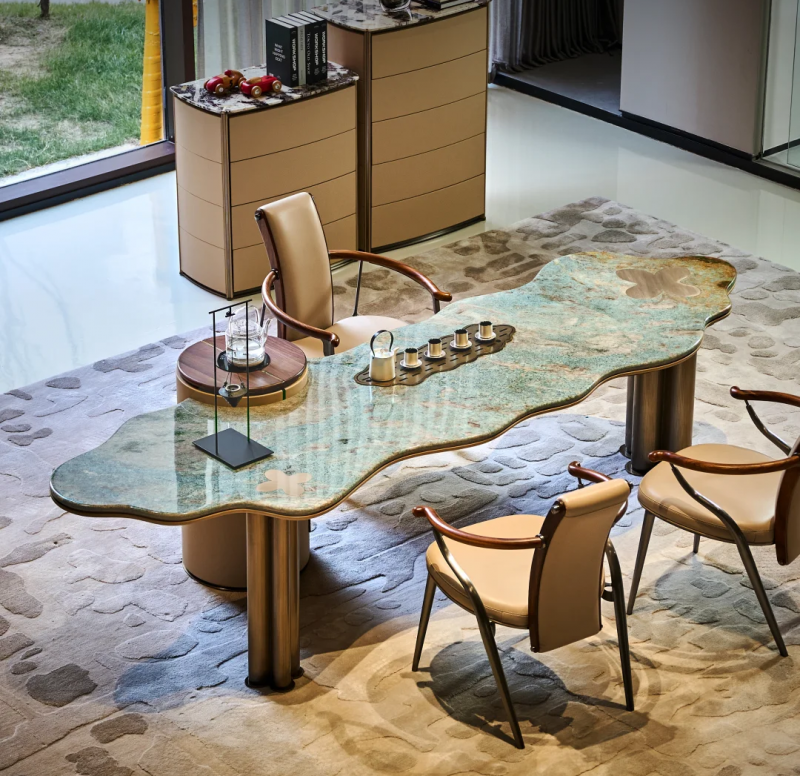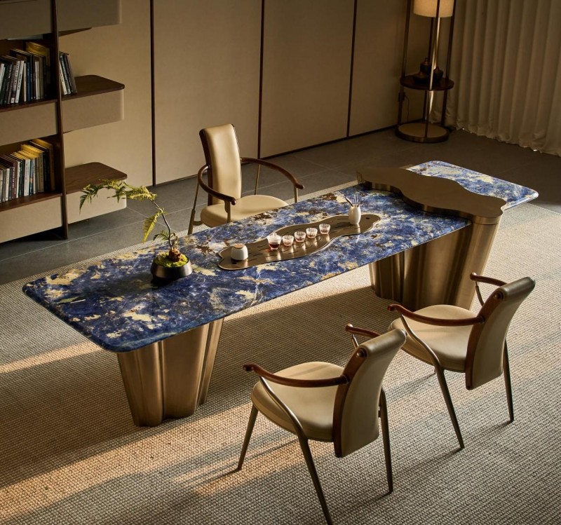 它捕捉的是海洋深处的灵感,台面采用深邃的蓝宝石质感材质,表面晶体的独特纹理如同被定格的海浪,层层叠叠,起伏间尽显自然的磅礴之美。坐在海螺茶桌旁品茗,仿佛能听见潮汐的低语。这种将自然奇观微缩于方寸之间的能力,正是魅力大师的独到之处。对于拥有海景别墅或偏爱自然度假风的豪宅来说,海螺茶桌能将室外的辽阔与室内的静谧无缝衔接,让饮茶成为一种沉浸式的感官享受。