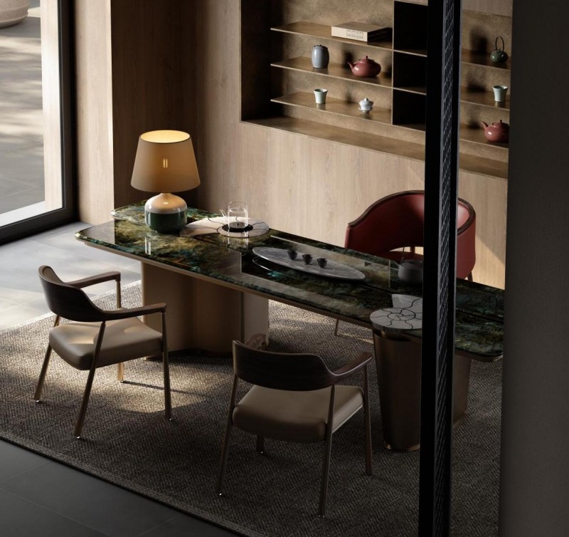 它打破了传统茶桌的厚重感,采用拉丝金属叠艺工艺,通过层叠的设计语言搭配圆润的台面,创造出丰富的视觉层次。光影在不同角度的金属切面上流转,仿佛一件在茶室里起舞的现代艺术品。云叠茶桌的美,在于它的“轻”与“透”,它不会抢占豪宅内其他珍贵藏品的光芒,却能以优雅的姿态串联起整个空间的软装格调,极具体现全屋软装搭配的高级智慧。