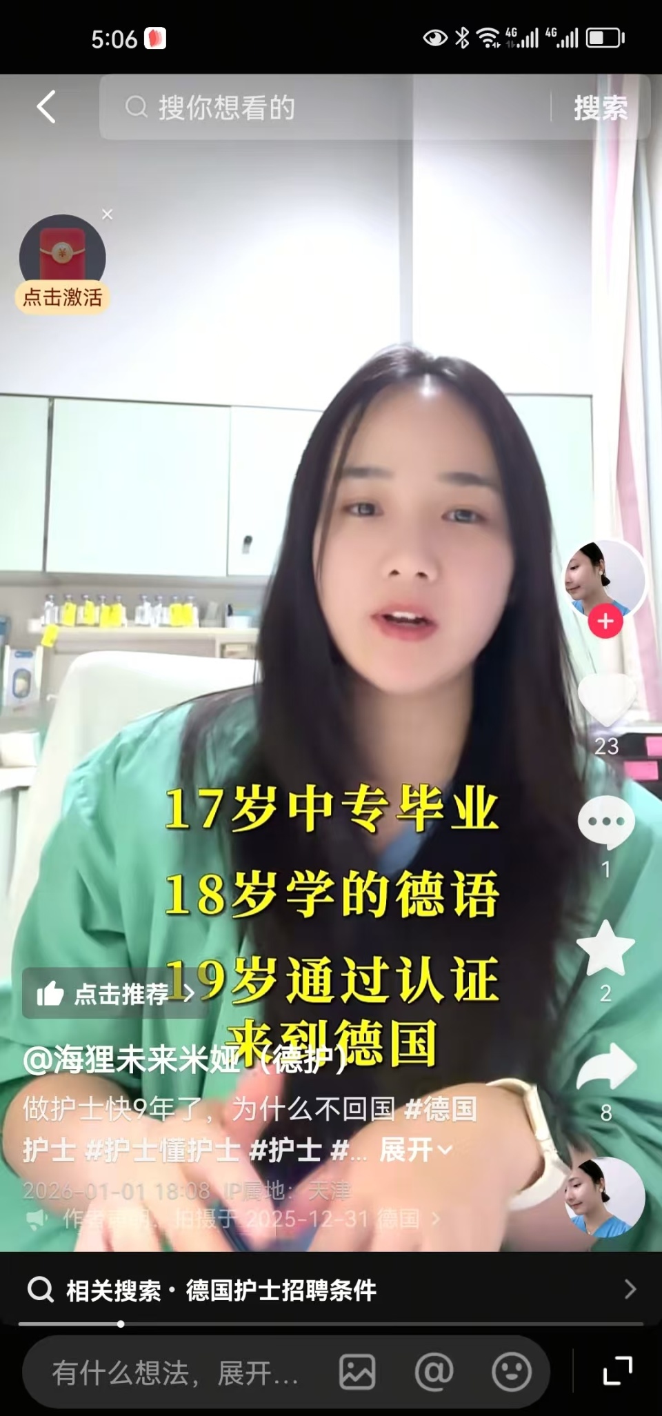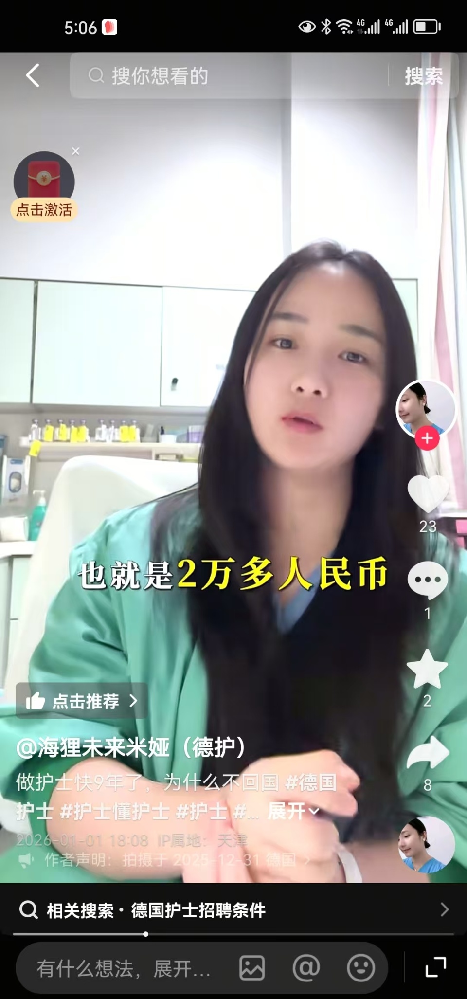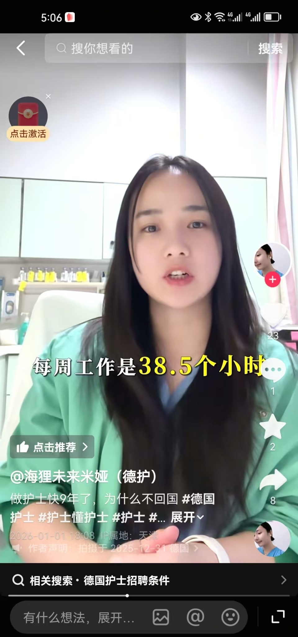 一名在德国做护士的中国女孩,这几天也在不断发视频。她17岁中专毕业,18岁学德语,19岁通过认证到德国。因为她有护士证很轻松地就在当地大医院找到了工作,起步月薪3000欧元,现在干了8年月薪涨到1万欧。3000欧就是2.46万人民币,现在她月薪是8万人民币。