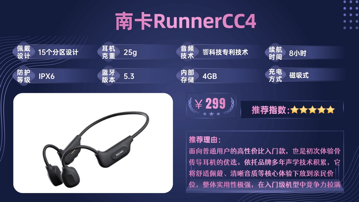 南卡RunnerCC4是面向普通用户的高性价比入门款,也是初次体验骨传导耳机的优选。依托品牌多年声学技术积累,它将舒适佩戴、清晰音质等核心体验下放到亲民价位,整体实用性极强,在入门级机型中竞争力拉满。