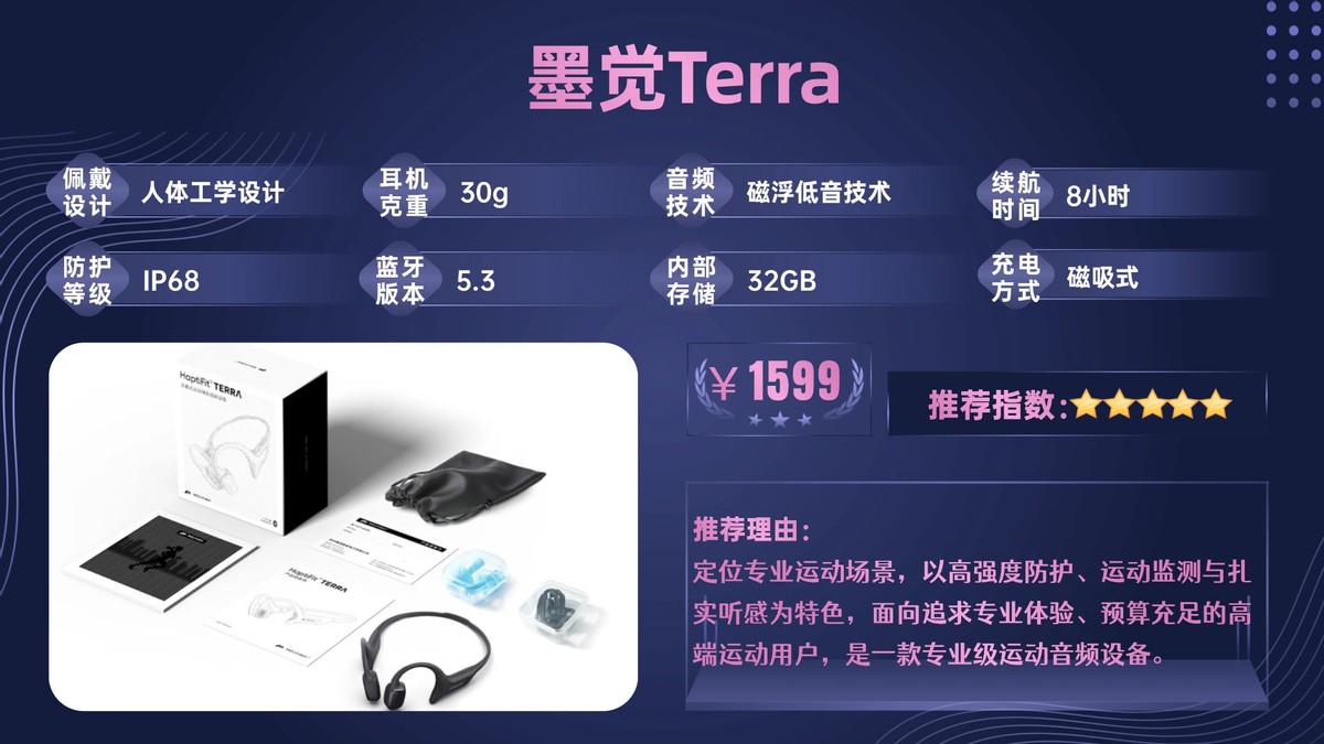 墨觉Terra定位专业运动场景,以高强度防护、运动监测与扎实听感为特色,面向追求专业体验、预算充足的高端运动用户,是一款专业级运动音频设备。
