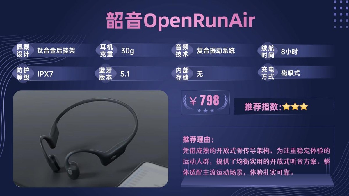 韶音OpenRunAir凭借成熟的开放式骨传导架构,为注重稳定体验的运动人群,提供了均衡实用的开放式听音方案,整体适配主流运动场景,体验扎实可靠。