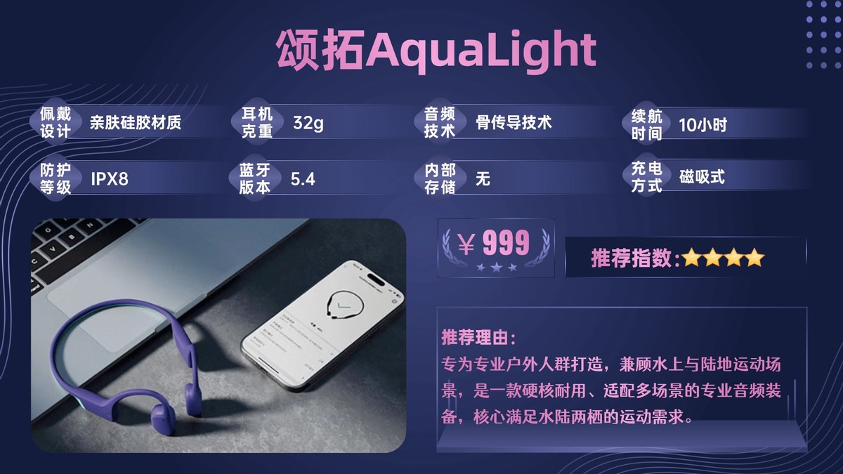 该机核心优势为专业防护、运动监测与优质听感,完美适配中高强度运动。适合有运动数据记录需求、追求专业性能的高端运动爱好者,是中高强度运动场景中的标杆级骨传导耳机。