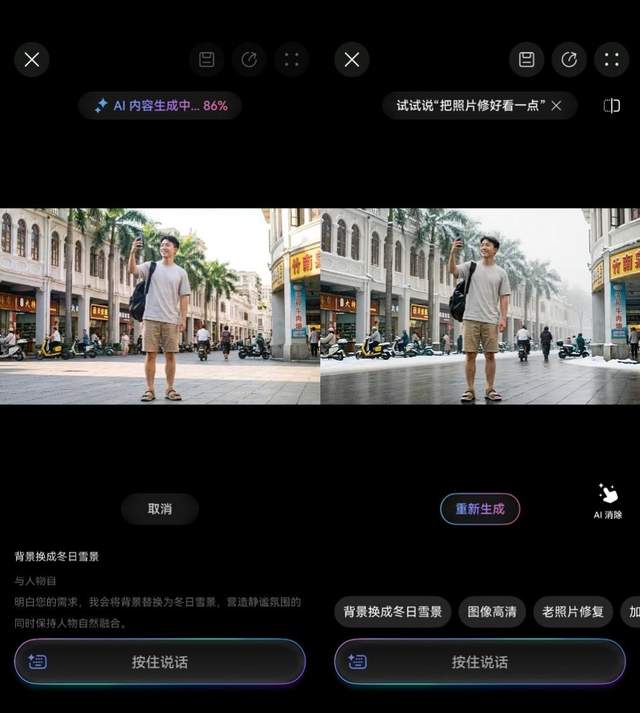 现在,更聪明的选择是直接跟小艺聊聊。只需唤醒小艺修图,像对朋友一样说出我的需求:“小艺,把路人去掉”“把天调蓝”“人像精修”……小艺就能帮我们完成专业修图。身为南方人的我,向往北方那种大雪纷飞的氛围感。我决定玩点儿新花样,直接让小艺“把背景换成雪景”。不用学复杂的修图参数,你的想象力,就是最好的修图工具。